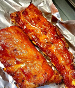 :腌渍后油炸,配以蔬菜翻炒,汤汁浓郁,色泽红润。香草烤排骨- 材料: