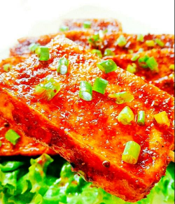 - 在烤盘铺上锡纸,防止粘连,将豆腐摆放整齐并刷上腌料。
