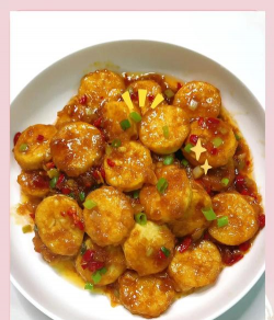 - 豆腐裹淀粉炸后,淋上糖醋汁(生抽、醋、番茄酱、淀粉勾芡)翻炒。 - 可加入虾仁增加鲜味。
