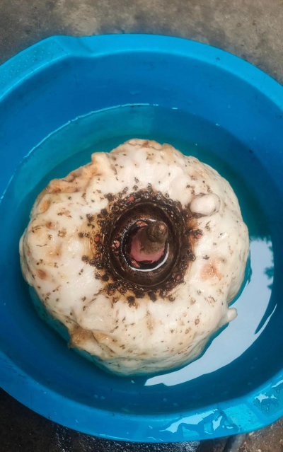 - 将魔芋切成大块,可用木板擦子或刀背轻柔摩擦成泥状,或用机械研磨机处理。