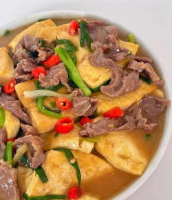 牛肉炒至变色后与炸豆腐一起翻炒,加蚝油、生抽调味。