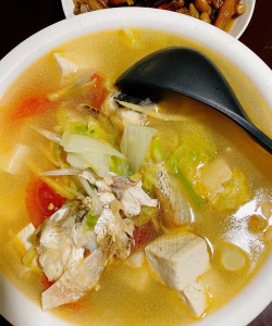 处理食材:鱼去鳞腹内脏,两面划刀后用盐、料酒腌制1小时;豆腐切块备用。2. 煎鱼:热锅冷油,将鱼两面煎至金黄,盛出备用。3. 煮汤:锅中加水烧开,放入姜片、葱段,加入豆腐煮5分钟;再放入煎好的鱼,煮2-3分钟。4. 调味:加盐、白胡椒粉、生抽、鸡精调味,撒上葱花即可。