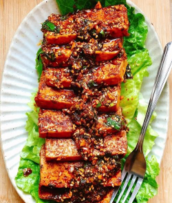 1. 豆腐切厚片,裹上面粉和打散的鸡蛋液(可选)。2. 热锅冷油,将豆腐两面煎至金黄,盛出备用。3. 锅中留底油,爆香蒜末和青椒块。4. 加入辣酱、生抽、蚝油调成酱汁,煮开后倒入豆腐。5. 小火炖煮10分钟,让豆腐入味,最后撒上葱花装饰。