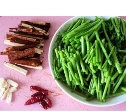 辅料:豆腐干100-200克(切条或丁)、红辣椒1条、大蒜1头、葱1根、花椒皮6粒、姜1小块