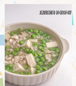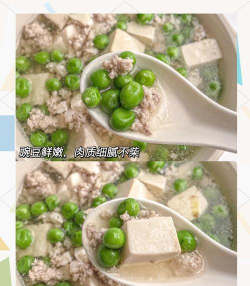 - 倒入焯水后的豌豆和豆腐,加盐、胡椒粉调味;
