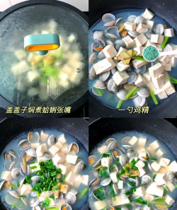 - 加入吐沙后的蛏子,翻炒至开口后倒入适量高汤或清水(没过食材),大火煮开后转小火炖煮15-20分钟,让蛏子的鲜味充分融入汤中。 - 若使用老豆腐,可加入一小撮淀粉水(淀粉与水1:2)防止凝固。