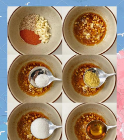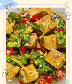 豆腐焯水:将豆腐切小方块,用沸水焯水10秒后捞出,沥干水分备用。2. 调制酱汁:柠檬汁与蜂蜜混合,加入蒜末、小米椒圈、紫苏叶丝,淋上橄榄油,撒上葱花和海盐,搅拌均匀。3. 凉拌组合:将焯水后的豆腐放入酱汁中,拌匀后即可食用。