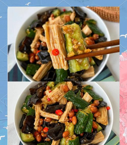 豆腐皮处理:干豆腐皮泡发后焯水,冷却后切丝,沥干水分。2. 酱汁调配:柠檬汁、糖、生抽、香醋混合,加入蒜末、小米辣,搅拌均匀。3. 凉拌组合:将豆腐皮丝与蔬菜丝(如黄瓜、胡萝卜)混合,倒入酱汁,拌匀后冷藏15分钟。