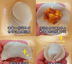 取馄饨皮对折,擀成薄圆片,边缘向内卷起成半圆形或三角形,两个角错开三分之一。
