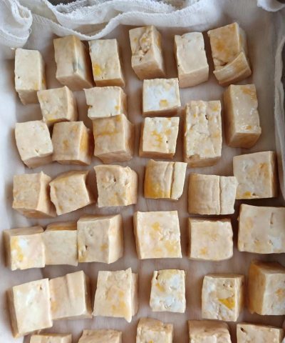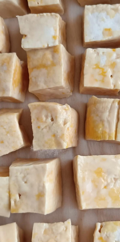 - 蒸制豆腐:在蒸锅中加水烧开,将豆腐块摆放在蒸架上(注意不重叠),蒸5分钟去除表面杂菌并蒸发部分水分,蒸后放凉备用。