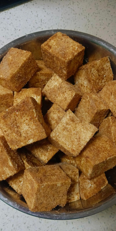 - 在豆腐块表面均匀抹盐(薄薄一层),可搭配花椒粉、辣椒粉等调料提香。