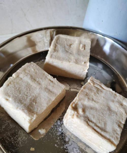 - 每天翻面1次,避免粘连。晴天需2-3小时,雨天可延长至4-5小时,直至豆腐变干变硬,表面微黄。