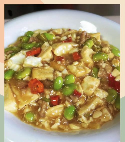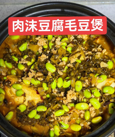 酸菜毛豆炖豆腐:加入五花肉末炖煮,酸菜的酸味渗透豆腐,营养丰富。