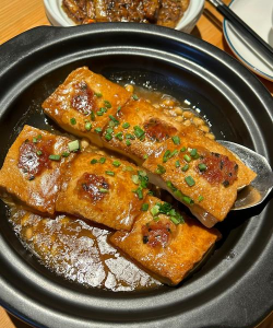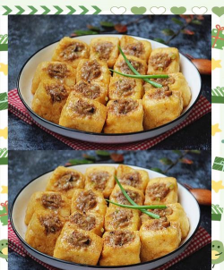 四、口味变体客家酿豆腐:在豆腐中间挖洞填入肉馅(如猪肉末、香菇末),煎至两面金黄后淋上调料汁。