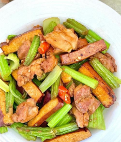 # 材料与步骤食材:芹菜500g、北豆腐1块(约300g)、五花肉100g、葱姜蒜适量、料酒、生抽、盐、蚝油、胡椒粉。
