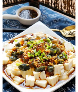 - 剥去皮蛋外壳,用温水浸泡后切小块或月牙状,摆放在豆腐周围或顶部。