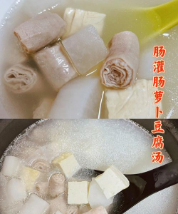 - 倒入豆腐,翻炒均匀后加水炖煮1小时左右,至小肠酥烂、豆腐入味。