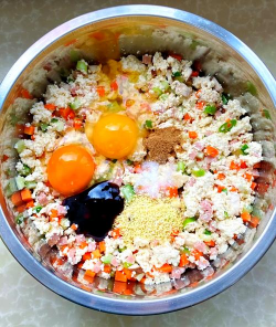豆腐泥与肉馅混合,加入香菇末、虾仁、葱姜蒜末等辅料,充分搅拌