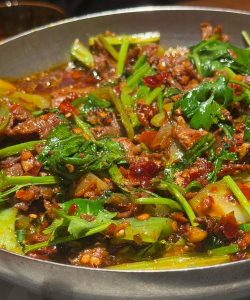 - 开大火收汁,让牛肉和蔬菜裹满酱汁,最后撒上香菜/葱花点缀