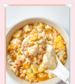 材料:豆腐30g、鸡蛋1个、猪肉20g、虾皮