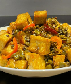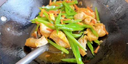 - 锅中留底油,爆香蒜末,加入豆角翻炒至断生。 - 倒入豆腐,加生抽、蚝油、盐调味,翻炒均匀。3. 调味收汁