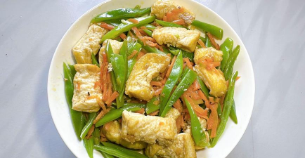 - 锅中留底油,爆香蒜末和葱末,加入豆角翻炒至断生。 - 倒入煎好的豆腐,加生抽、蚝油、盐调味,翻炒均匀。
