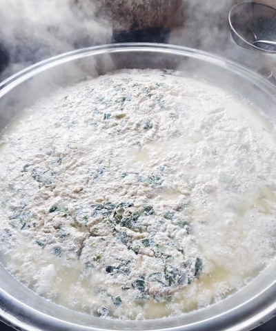 - 放入焯水后的青菜叶(切细),继续煮3分钟,关火后滤水,制成嫩豆腐。