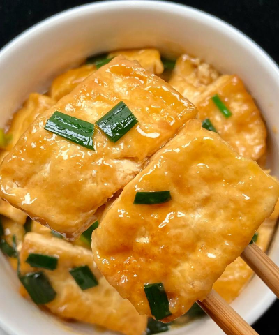 1. 豆腐裹蛋液煎至金黄,裹上椒盐酱汁;