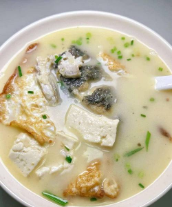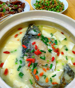 二、鲢鱼豆腐汤 特点: 清淡鲜美,营养丰富,适合冬季滋补。 鲢鱼头1个(约860克) 嫩豆腐1盒(约300克) 生姜5片 葱2根 蒜3瓣 盐1/3汤匙 米酒3汤匙 鸡粉1/2汤匙 香菜2棵