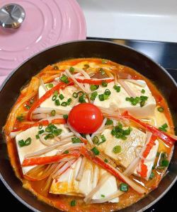 - 加入豆腐块,继续炖煮2-3分钟,让豆腐充分吸收汤汁。