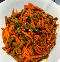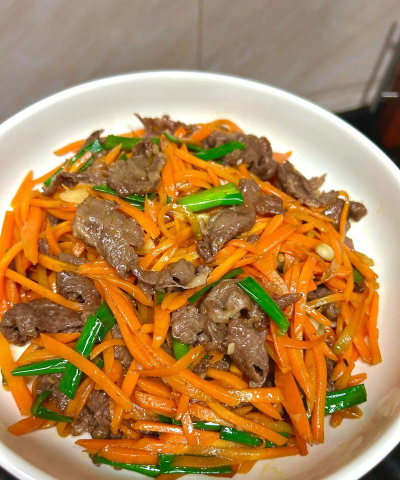 - 加入胡萝卜丝翻炒至软糯,再倒入牛肉丝,翻炒均匀。