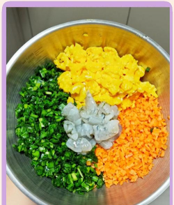 - 将炒好的蔬菜与炒熟的鸡蛋混合,加入香菇、木耳等提鲜食材,最后淋入香油或食用油拌匀。