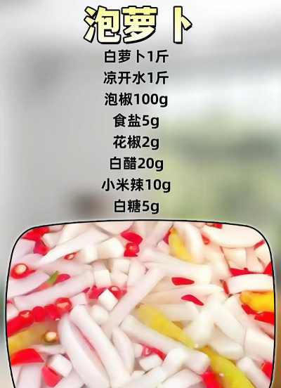 注意事项 选材:选择皮薄肉嫩的胡萝卜(如樱桃萝卜)更易入味。2. 发酵:泡制时间根据温度调整,夏季需缩短时间并冷藏。3. 卫生:容器需密封良好,避免杂菌污染。以上做法可根据口味调整配料比例,建议先尝试经典酸辣或糖醋版本,再尝试其他风味。