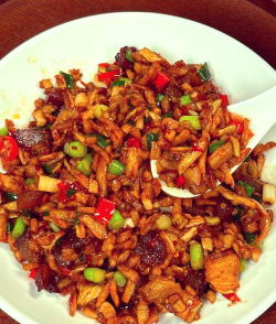 - 加入胡萝卜干大火翻炒2-3分钟,使其充分吸收肉香。