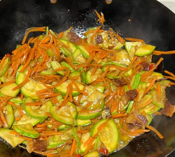 - 加入西葫芦丝翻炒至断生,再加入胡萝卜丝继续翻炒