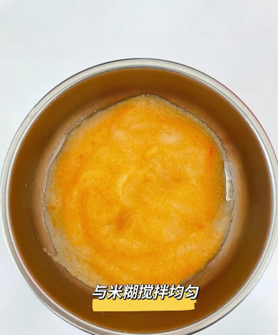 - 将蒸好的胡萝卜泥放入碗中,加入米粉,用勺子或搅拌机搅拌均匀。