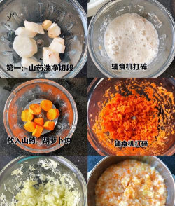 - 山药泥煮至浓稠后,加入肉类(炒熟后剁碎)和蔬菜末(煮1分钟)