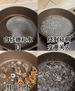 - 平底锅加少量水,放入白糖熬煮至冒泡并开始粘稠(需小火防止糊底)。 - 当糖浆变为深琥珀色且开始返砂时,关火备用。