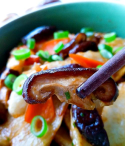 加蒜末、生抽、醋、辣椒油混合,倒入香菇山药翻炒均匀。