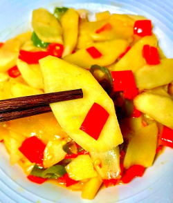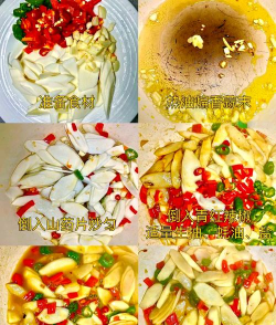 - 爆香配料: 热锅冷油,先煸炒花椒或干辣椒至香,再加入蒜末、青红椒丝翻炒 - 快炒山药