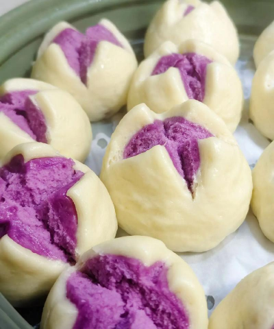 将面团擀开,均匀铺上紫薯泥,从一端卷起并切成小块。盖上保鲜膜,发酵至两倍大后,放入沸水锅中蒸12分钟即可。
