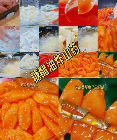 焯水山药片:山药片焯水后过凉,沥干水分。2. 调制酱汁:糖、醋、生抽、蚝油混合,加淀粉水勾芡。3. 翻炒上色:锅中倒油,炒糖至拉丝,加入山药翻炒均匀,淋上调汁即可。