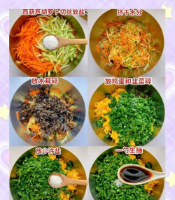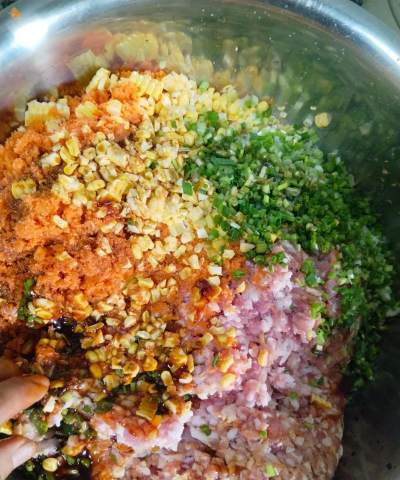 放入葱末、姜末、海鲜酱油、耗油、少许盐(可不放)、花椒面、海米,顺时针搅拌成饺子馅。