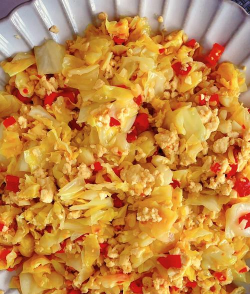 - 包菜切块或丝,豆腐切块焯水备用;葱姜蒜、干辣椒、花椒切末备用。
