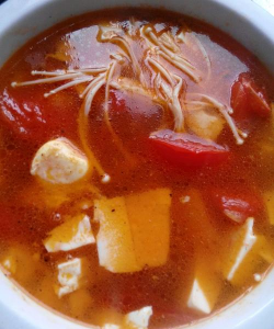 - 最后撒入葱花,翻炒均匀后勾薄芡,汤汁浓稠即可出锅。### 二、番茄山药豆腐金针菇汤