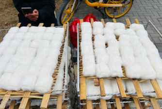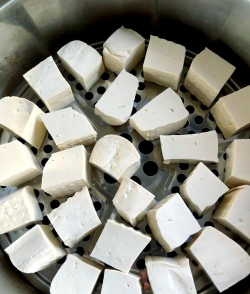 将豆腐块放入蒸笼中,盖上盖子,放在阴凉处晾干水分,大约需要2-3天。