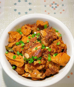 调味收汁:炖煮40-60分钟至排骨酥烂,汤汁浓稠。根据口味加入盐、白胡椒粉调味,最后撒上葱花或香菜点缀。