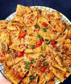 - 将调好的辣酱汁淋在豆皮上,裹上一层干辣椒粉或芝麻。