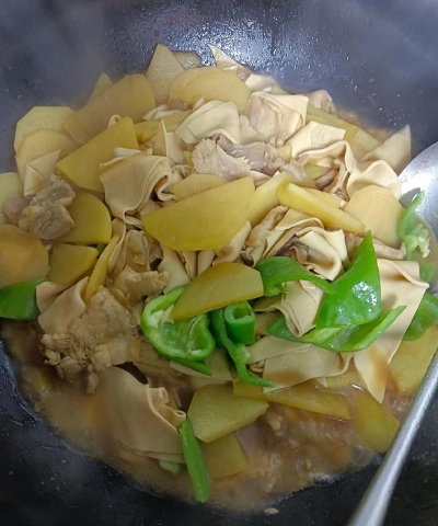 - 热锅凉油,煸炒葱姜蒜末和肉类至变色。 - 加入土豆片翻炒至表面微黄,倒入生抽、蚝油、料酒调味。 - 加适量清水烧开后转小火炖煮10-15分钟,使土豆软糯。 - 加入干豆腐继续炖煮5分钟,收汁至汤汁浓稠,加盐调味即可。