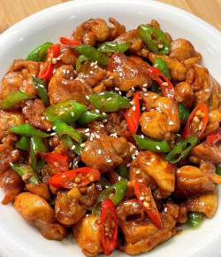 - 混合翻炒:倒入炒好的鸡肉,加入青椒块,调入生抽、老抽、蚝油,翻炒均匀。